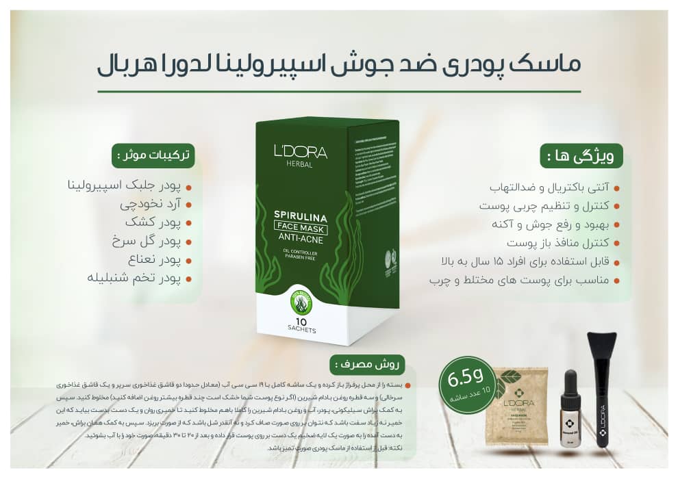 ماسک پودری اسپیرولینا ضدجوش لدورا هربال، بخاطر ترکیبات موثری که داره، به تنظیم و کنترل سطح چربی پوست کمک کرده و باعث بهبود و رفع جوشها و آکنهها میشه.